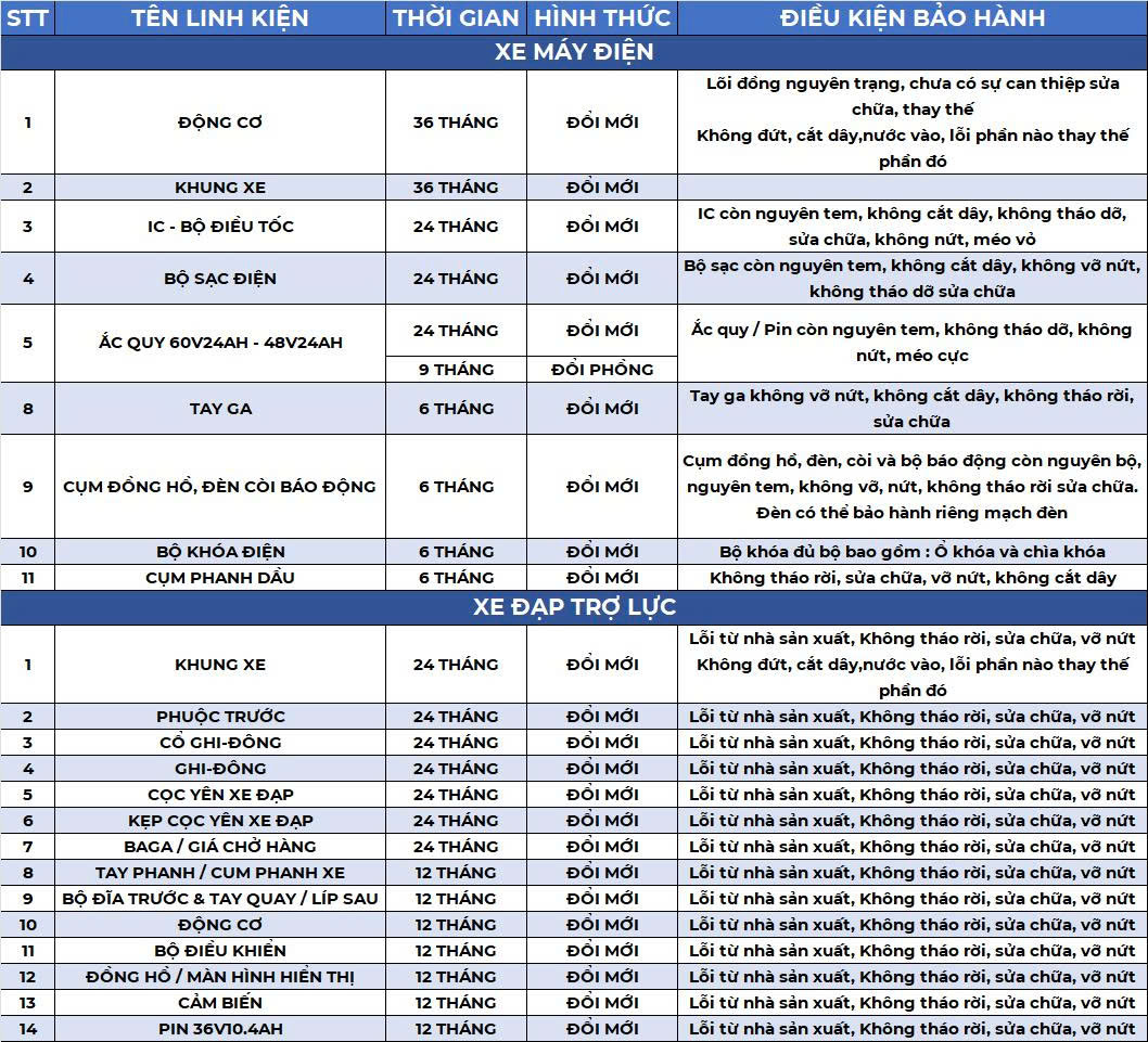 Bảng dưới là Chính sách bảo hành đặc quyền của DKBike áp dụng cho các dòng xe của hãng sản xuất và phân phối tại Việt Nam.