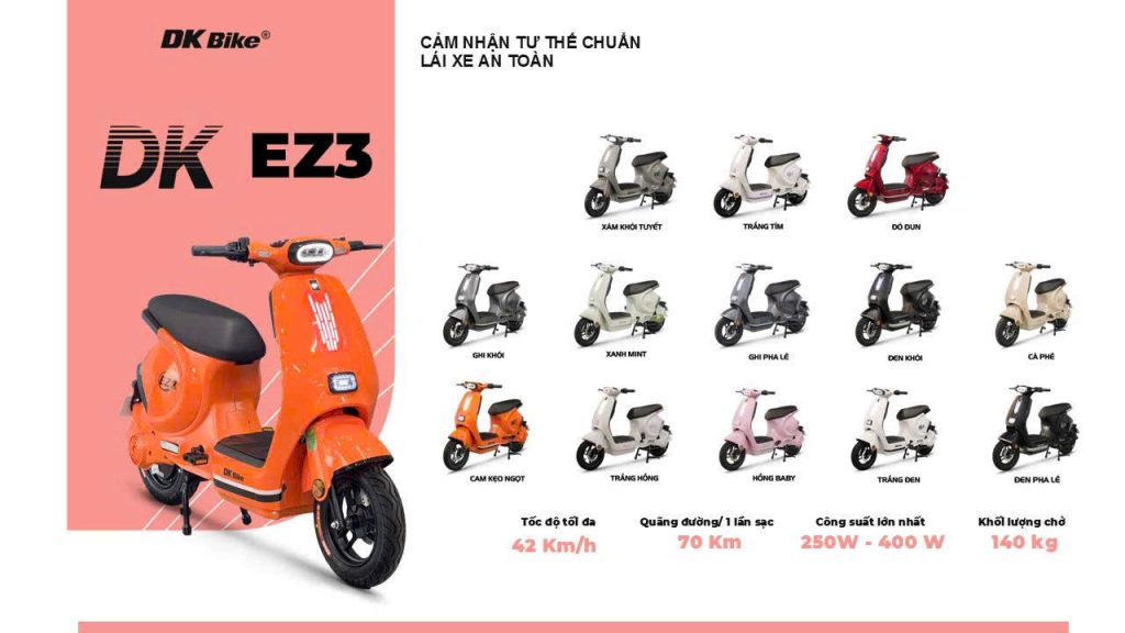 | Màu sắc xe máy điện DK EZ 3 | Cam kẹo ngọt, Cà phê, Đen khói, Đỏ đun, Ghi khói, Ghi pha lê, Hồng baby, Trắng đen, Trắng hồng, Trắng tím, Xám khói tuyết, Xanh mint |